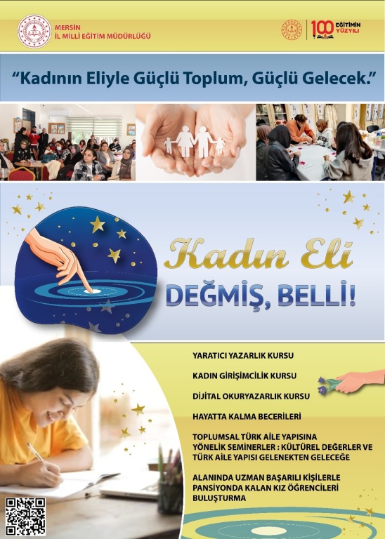 Bu kapsamda; 2025-2026 eğitim-öğretim yılında Mersin ilimizdeki 13 ilçede eş zamanlı olarak uygulanacak proje, kadınların ve lise düzeyinde öğrenim gören kız öğrencilerin kişisel, sosyal ve mesleki kapasitelerini artırmayı; aile içi iletişimi güçlendirmeyi ve toplumsal bağları kuvvetlendirmeyi hedeflemektedir.
